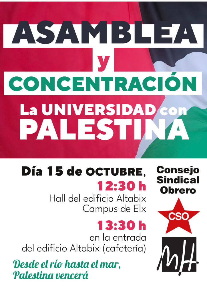 Diversas organizaciones sindicales han convocado una Huelga General de 24 horas en todo el Estado español el próximo Miércoles 15 de octubre para condenar desde nuestra condición de trabajadoras y trabajadores el genocidio cometido en Palestina por la entidad colonial llamada Israel, exigir la ruptura de relaciones diplomáticas y de cualquier otra índole con la misma y para apoyar el derecho del pueblo palestino a existir y resistir.