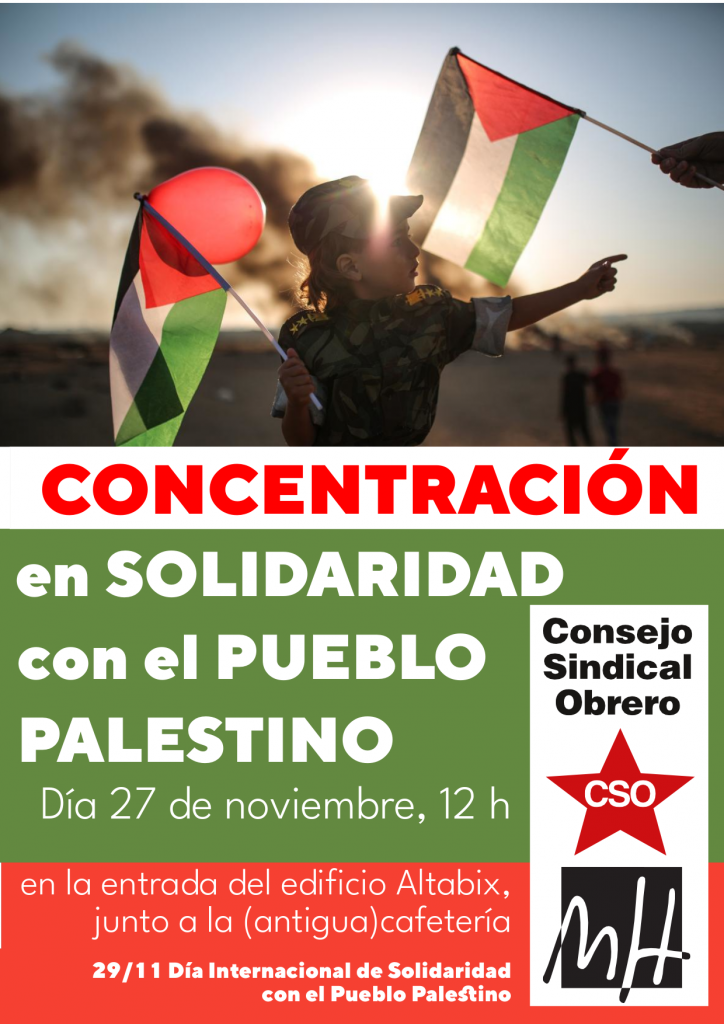 Mañana jueves 27 de noviembre a las 12 h en la entrada del edificio Altabix, junto a la cerrada cafetería,nos concentraremos en Solidaridad con el Pueblo Palestino ante el genocidio perpetrado por el estado sionista de Israel.